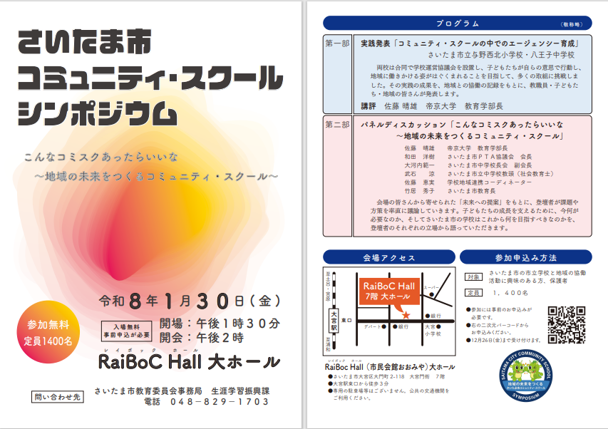 | 2025年12月16日 | ホームページ | お知らせに「さいたま市 コミュニティ・スクール シンポジウム」について再掲載しました。 |